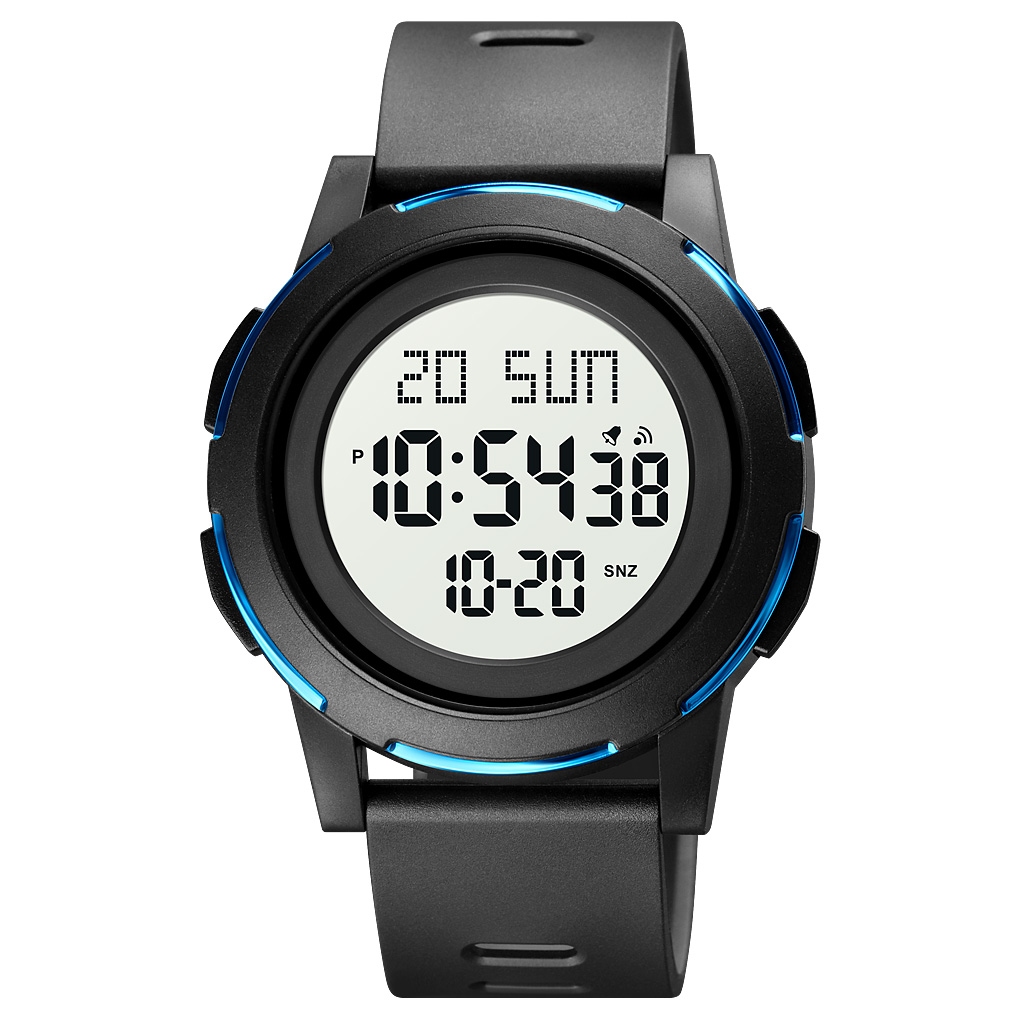 Корпус виконаний з міцного полімеру чорного кольору з блакитними акцентами, а ремінець з каучуку забезпечує комфорт під час носіння. Розміри годинника 51 х 45 мм, а його вага становить 42 г, що робить його легким і зручним. Електронний циферблат з арабськими цифрами надає чітку індикацію часу, дати та дня тижня.