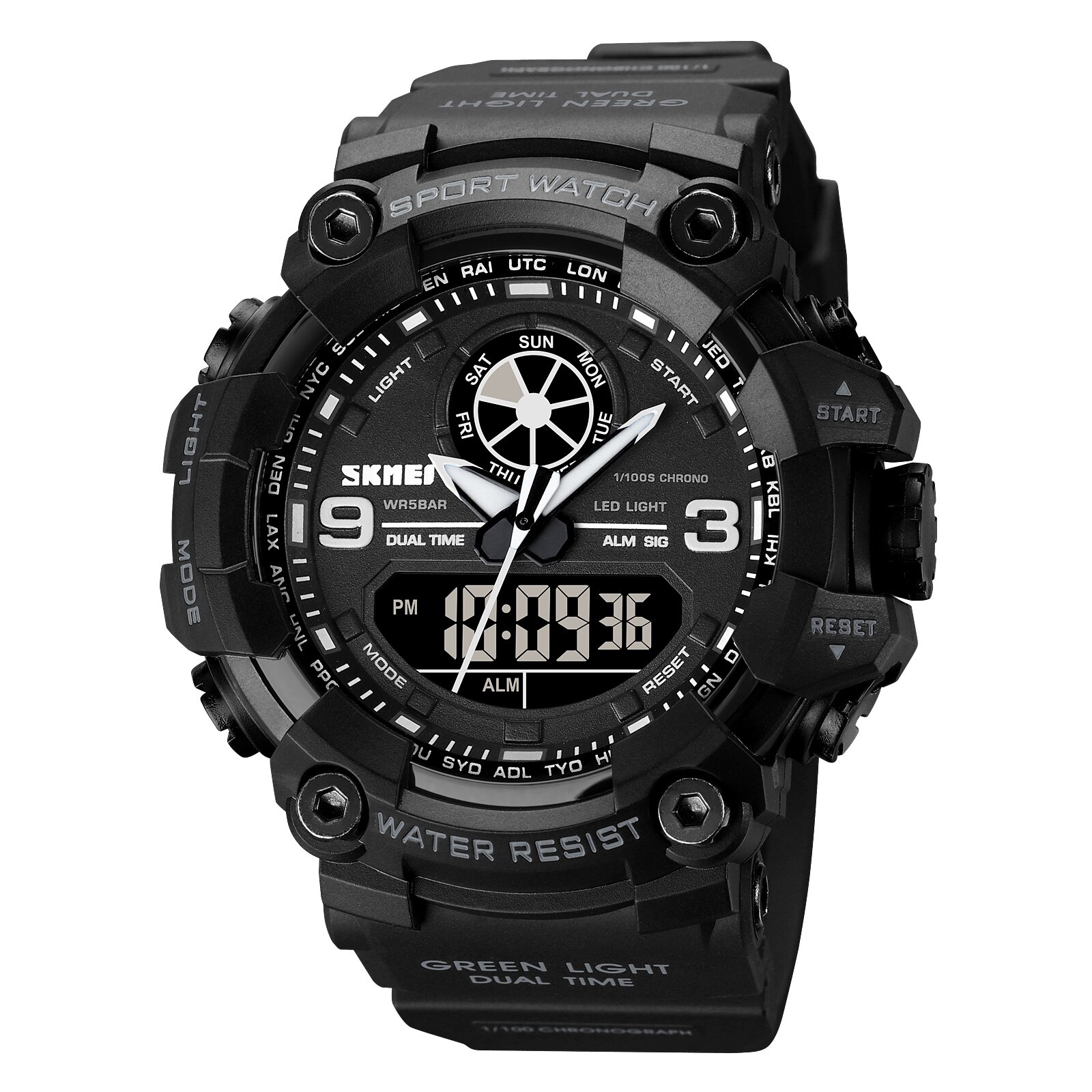 З водонепроникністю до 50 м, він ідеально підходить для активного відпочинку. Годинник обладнаний кварцовим механізмом з електронно-аналоговим циферблатом, що дозволяє точно відстежувати час. Додаткові функції, такі як будильник, календар, секундомір і другий часовий пояс, роблять його універсальним рішенням для повсякденного користування.
