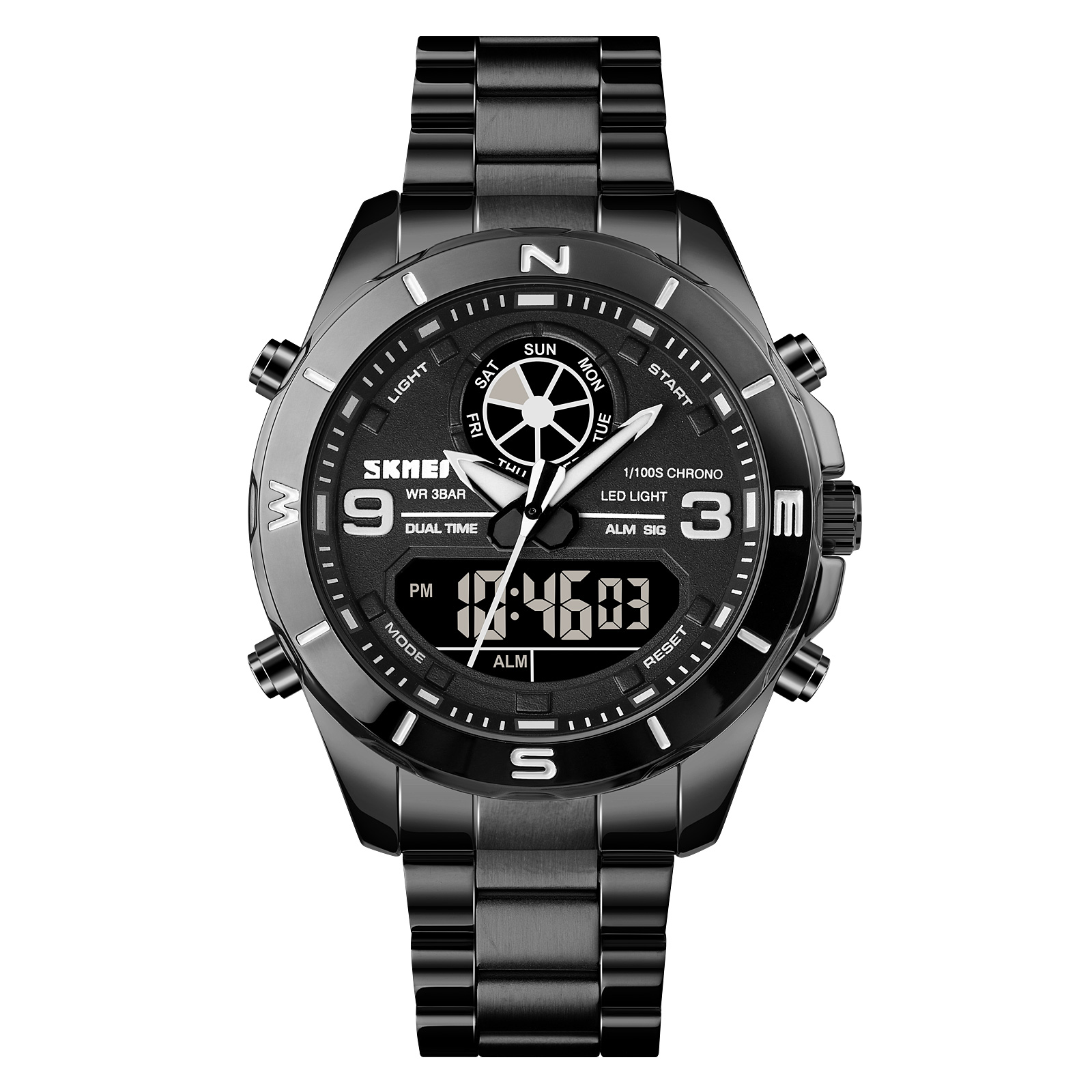 Skmei 1839BK оснащений кварцовим механізмом та стрілочно-електронним циферблатом, який відображає години, хвилини, секунди, день тижня та число. Додаткові функції включають будильник, календар, секундомір та другий часовий пояс. Годинник легко регулюється завдяки браслету з довжиною 23 см та шириною 20 см.