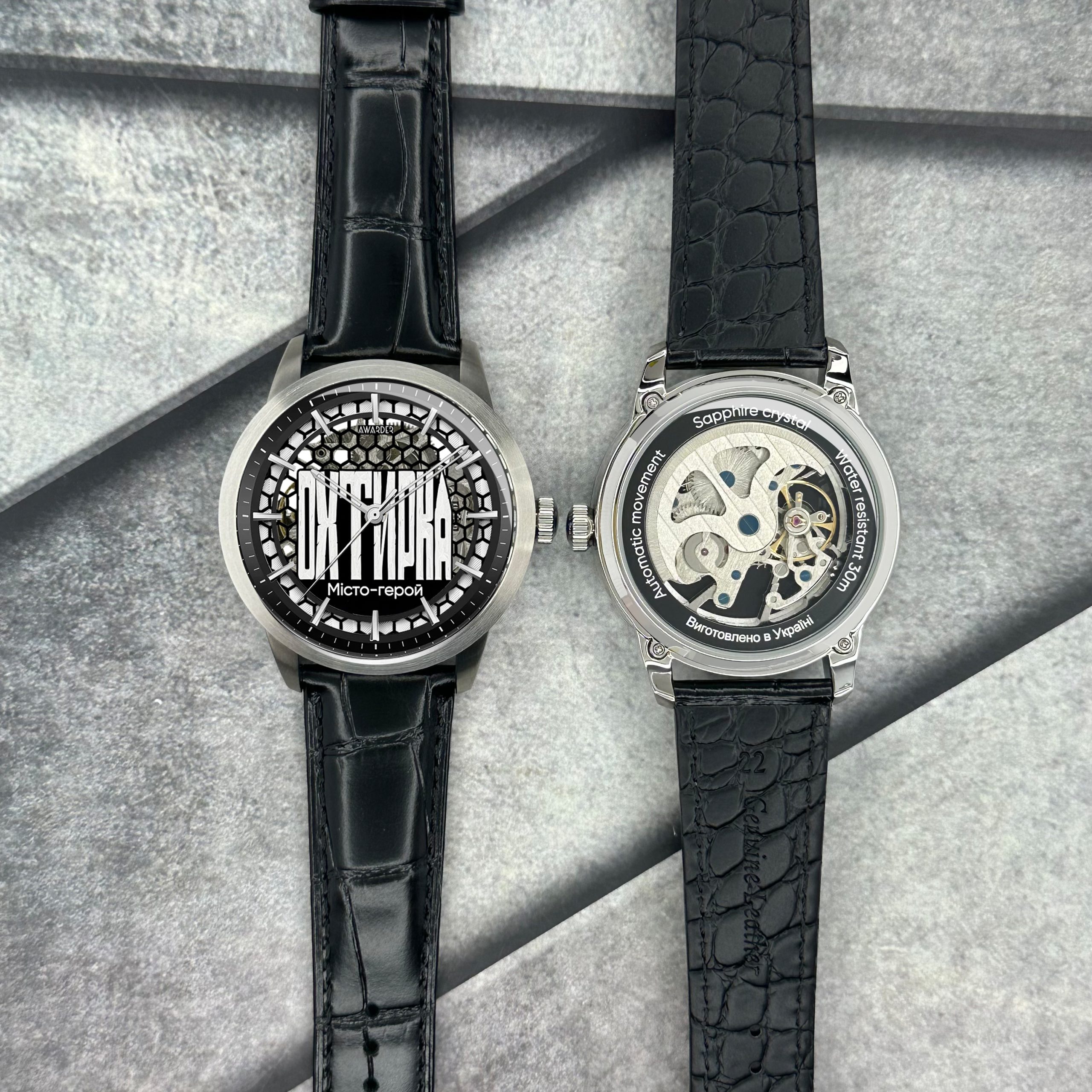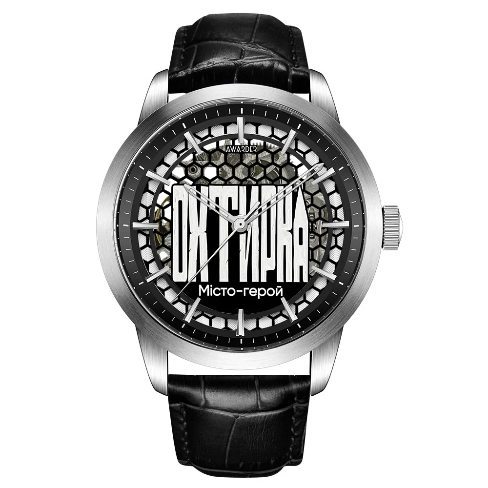 Годинник Awarder 043 Охтирка I — це елегантне поєднання класичного стилю та сучасних технологій. Виготовлений в Україні, цей чоловічий годинник вражає своїм бездоганним дизайном, зокрема корпусом із нержавіючої сталі сріблястого кольору та стильним чорним шкіряним ремінцем.