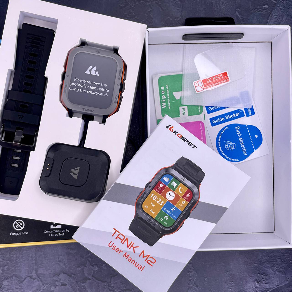 Електронний циферблат з мінеральним склом відображає не лише час, а й дати, погоду, рівень заряду акумулятора та багато іншого. Годинник володіє масштабом функцій, таких як будильник, моніторинг серцевого ритму, крокомір та управління музикою. Kospet Tank M2 також надає сповіщення про дзвінки, смс та активність у соціальних мережах.