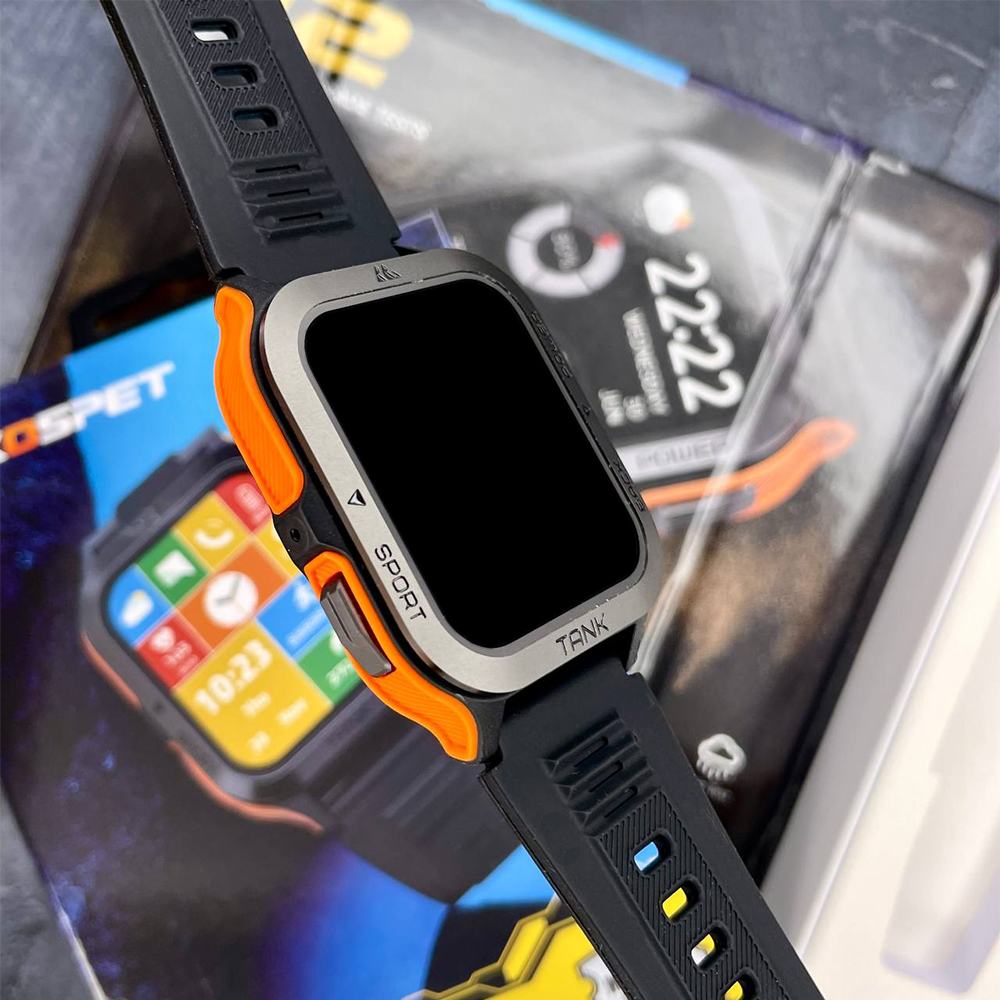 Розумний годинник Kospet Tank M2 Orange – це надійний спортивний аксесуар, що поєднує в собі стиль та функціональність. Він має водонепроникність до 50 м, що робить його ідеальним для активного способу життя. Корпус виготовлений з полімеру та сталі, а ремінець – з каучуку, забезпечуючи комфорт і довговічність.