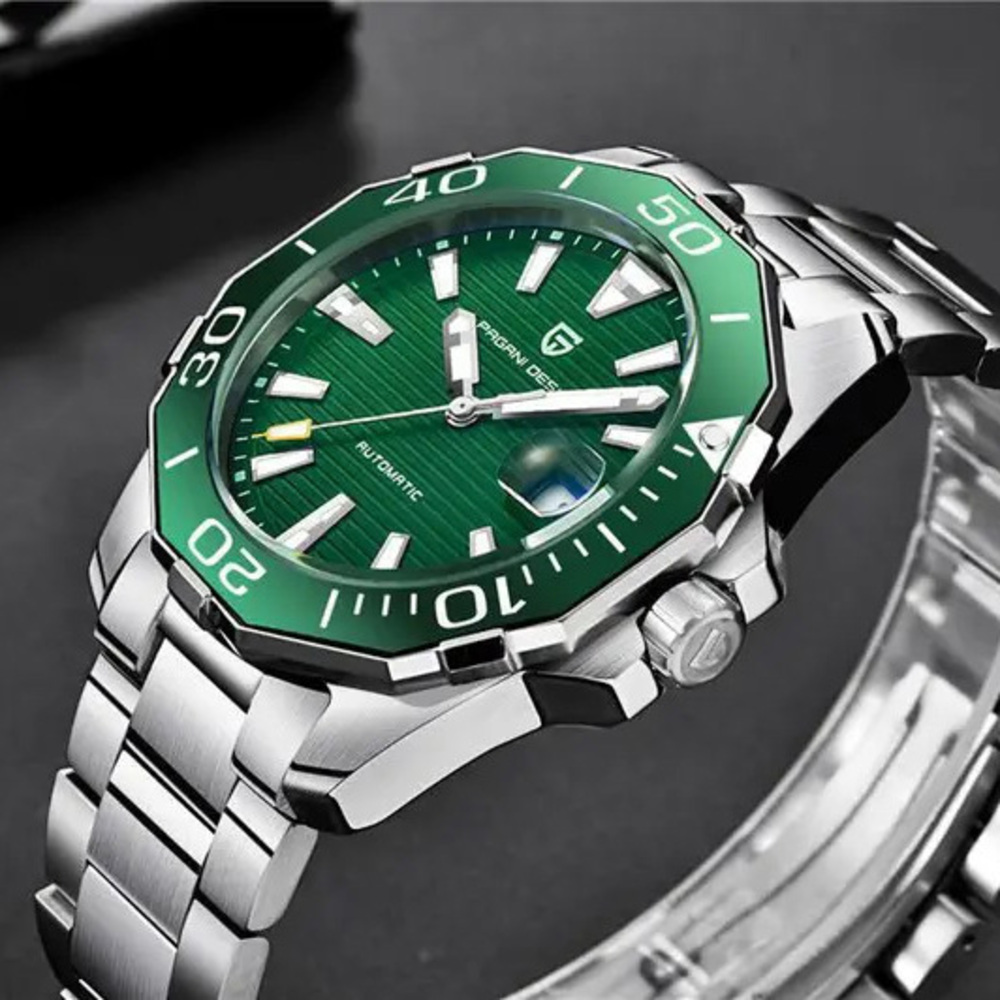 Годинник Pagani Design PD-1617 Silver-Green – це стильний та функціональний аксесуар для чоловіків. Його корпус виготовлений з нержавіючої сталі сріблястого кольору, що надає елегантного вигляду. Механічний з автопідзаводом тип механізм забезпечує високу точність роботи, а водонепроникність до 100 метрів робить його ідеальним для активних людей. Стильний круглий циферблат з індексною індикацією включає в себе календар і оснащений люмінесцентним підсвічуванням, що забезпечує зручність у темряві. Ремінець також виконаний з нержавіючої сталі, його ширина складає 22 мм, а довжина – 22 см. Гарантія на годинник становить 12 місяців. Цей годинник прекрасно доповнить ваш повсякденний та класичний стиль.