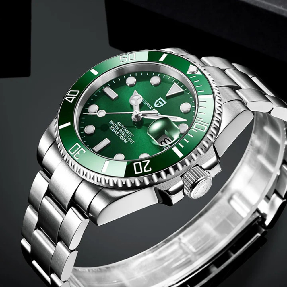 Годинник Pagani Design PD-1661 Silver-Green — стильний чоловічий аксесуар, який поєднує елегантність і функціональність. Корпус виготовлений з нержавіючої сталі та має круглу форму з привабливим зеленим та сріблястим оздобленням. Сапфірове скло забезпечує високу стійкість до подряпин. Завдяки водонепроникності до 100 м, ви можете носити його під час плавання чи занять спортом. Механічний механізм з автопідзаводом гарантує точність і надійність. Годинник обладнаний календарем та люмінесцентним підсвічуванням для зручності використання в темряві. Індикація часу представлена арабськими цифрами, а браслет з нержавіючої сталі забезпечує комфорт при носінні. Довжина ремінця складає 22 см, ширина — 20 см, а вага годинника — 154 г. Гарантія на годинник становить 12 місяців. Вироблено в Китаї.