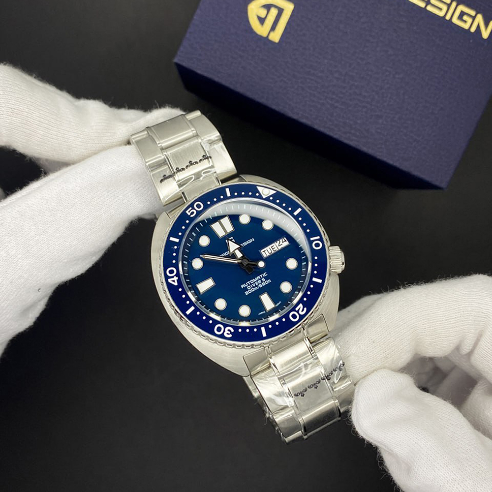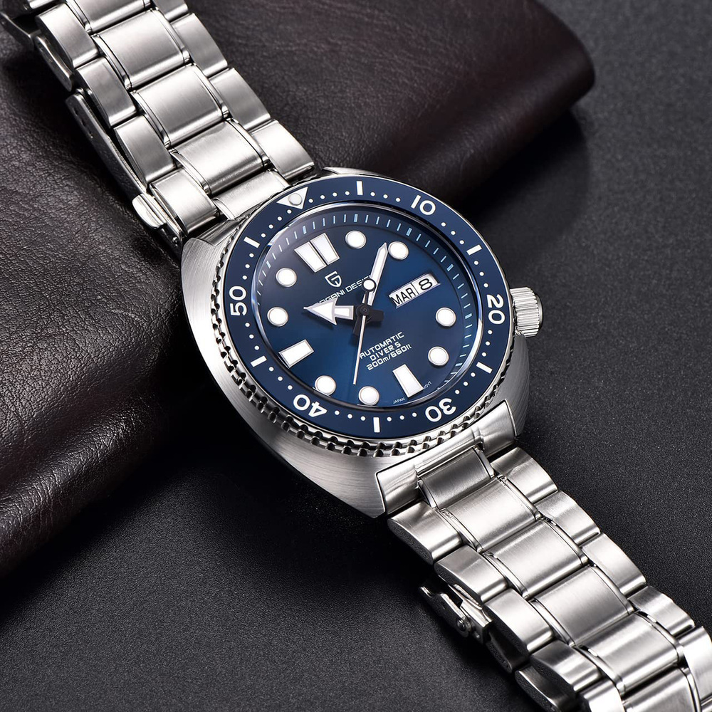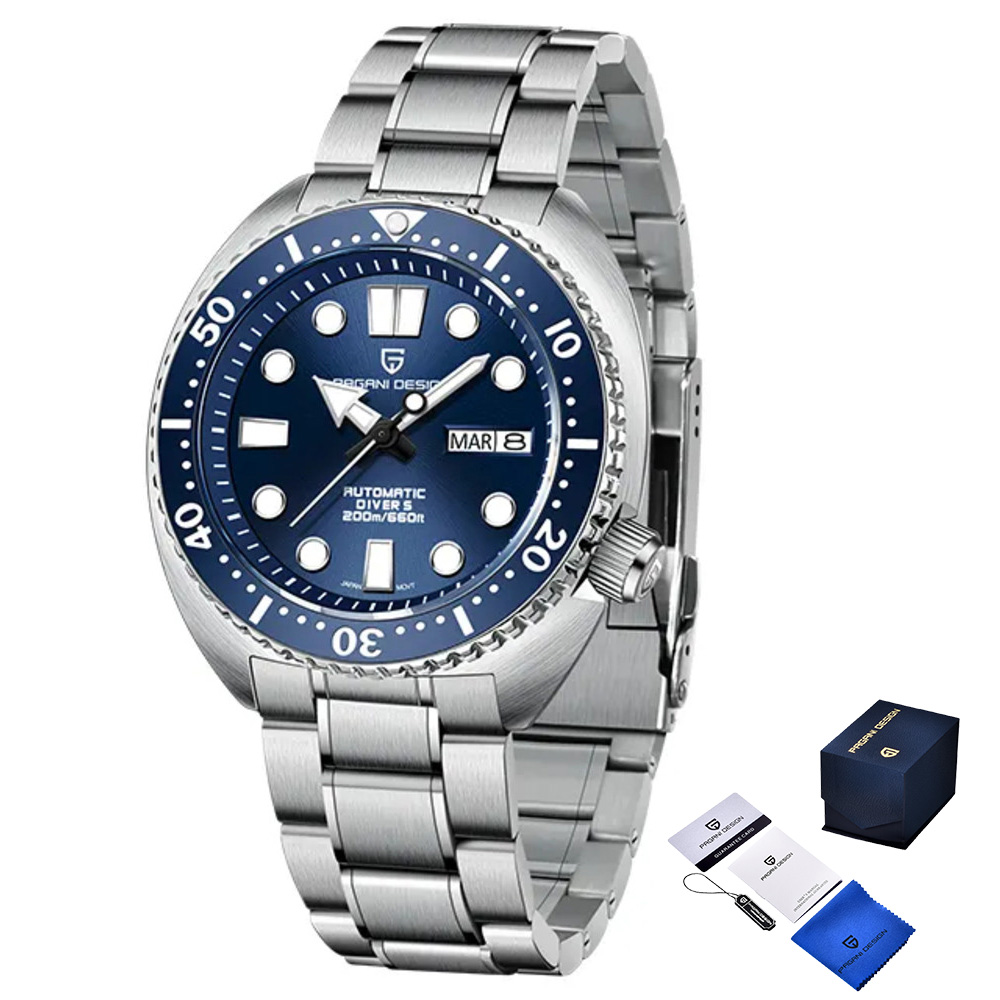 Годинник Pagani Design PD-1696 Silver-Blue — стильний механічний аксесуар для чоловіків, що поєднує класичний і casual стилі. Корпус і ремінець виготовлені з нержавіючої сталі сріблястого кольору, що забезпечує довговічність та елегантний вигляд. Водонепроникний до 200 м, цей годинник ідеально підходить для активного способу життя. Сапфірове скло захищає стрілочний циферблат з індикацією годин, хвилин, секунд, місяця та числа. Модель оснащена календарем і люмінесцентним підсвічуванням, що забезпечує зручність використання в темряві. Довжина ремінця — 22 см, ширина — 22 см, вага годинника становить 195 г. Цей годинник має 12-місячну гарантію та виготовлений в Китаї.