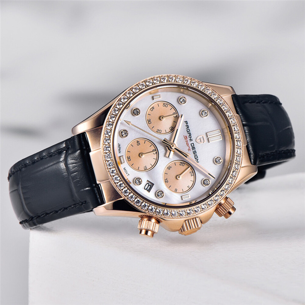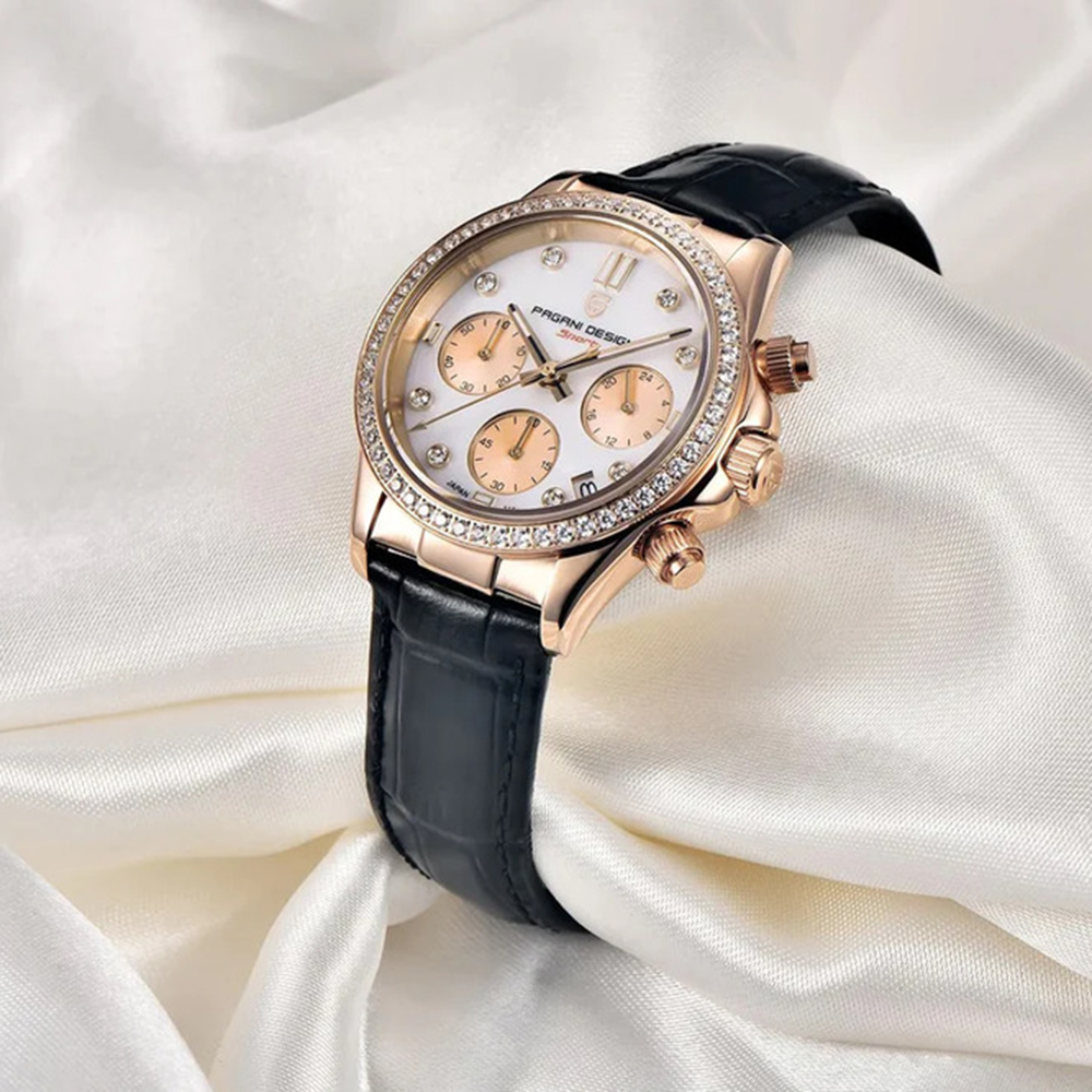 Годинник Pagani Design PD-1730 Gold-Black – стильний жіночий аксесуар з круглим корпусом, виготовлений з нержавіючої сталі. Має елегантний золотистий колір корпусу та чорний шкіряний ремінець. Водонепроникність до 100 м забезпечує надійність у різних умовах. Сапфірове скло надає захист від подряпин. Годинник оснащений кварцовим механізмом та функціями календаря і хронографа. Циферблат має індикатори годин, хвилин, секунд та числа, а також люмінесцентну підсвітку. Естетичний стиль годинника підходить для casual та класичних образів. Гарантія складає 12 місяців. Довжина ремінця – 21 см, ширина – 18 см, вага – 64 г. Вироблено в Китаї.