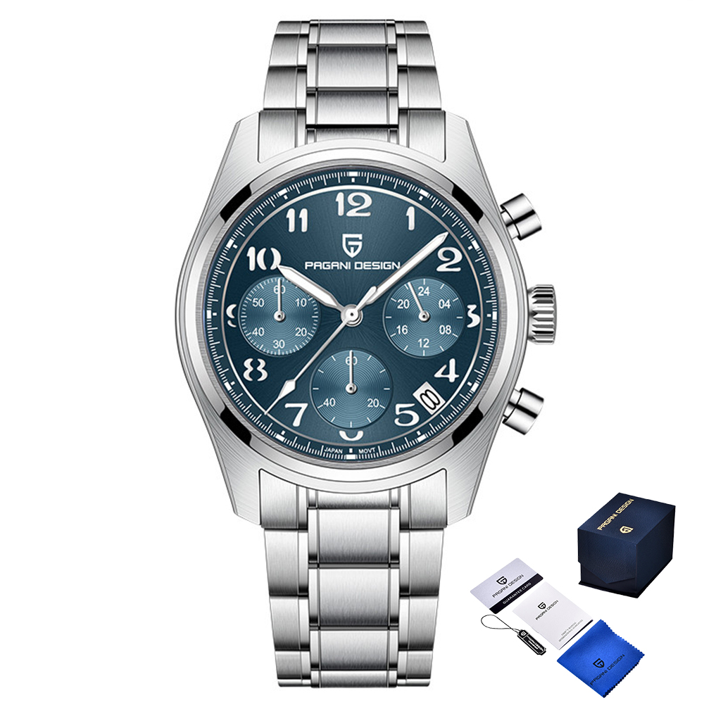 Годинник Pagani Design PD-1773 Silver-Blue поєднує у собі стиль та функціональність. Виготовлений з нержавіючої сталі, цей водонепроникний годинник з рівнем захисту 100 м має сапфірове скло, що гарантує високу стійкість до подряпин. Завдяки кварцовому механізму, ви завжди будете в курсі часу. Циферблат зі стрілочним індикатором і арабськими цифрами дозволяє легко читати час, а також має функцію календаря. Універсальний дизайн робить його підходящим як для чоловіків, так і для жінок. Люмінесцентне підсвічування забезпечує видимість у темряві. Годинник комплектується браслетом та має довжину ремінця 21 см при ширині 20 см. Вага годинника складає 120 г. Гарантія на виріб становить 12 місяців.