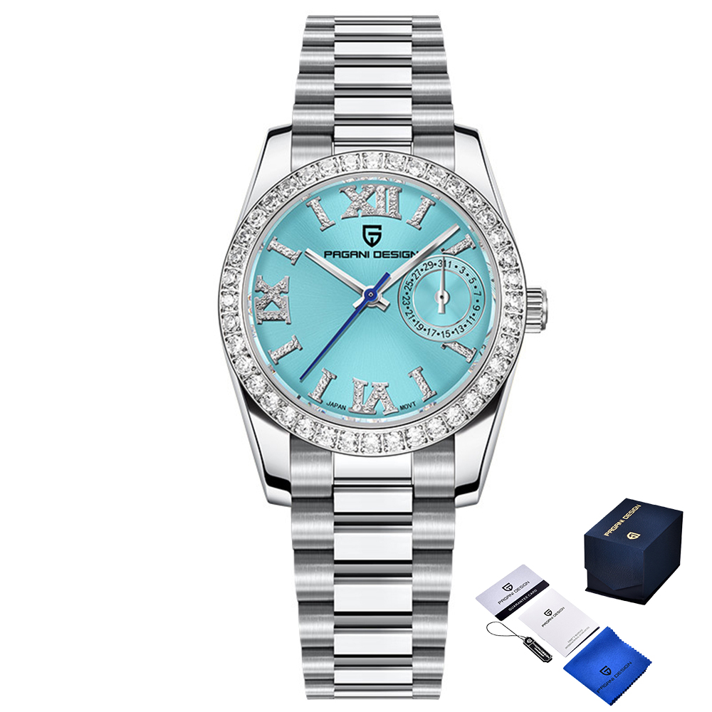 Годинник Pagani Design PD-1776 Silver-Blue – елегантний аксесуар, що підходить для будь-якої жінки. Корпус та ремінець виготовлені з нержавіючої сталі, що забезпечує довговічність та стильний вигляд. Водонепроникність 100 м дозволяє використовувати годинник під час водних процедур. Сапфірове скло захищає від подряпин, а кварцовий механізм гарантує точність. Циферблат має індикацію годин, хвилин, секунд та дати, а також виконаний у класичному стилі з римськими цифрами. Гарантія на годинник становить 12 місяців. Розміри годинника: 32 х 32 мм, вага – 91 г.