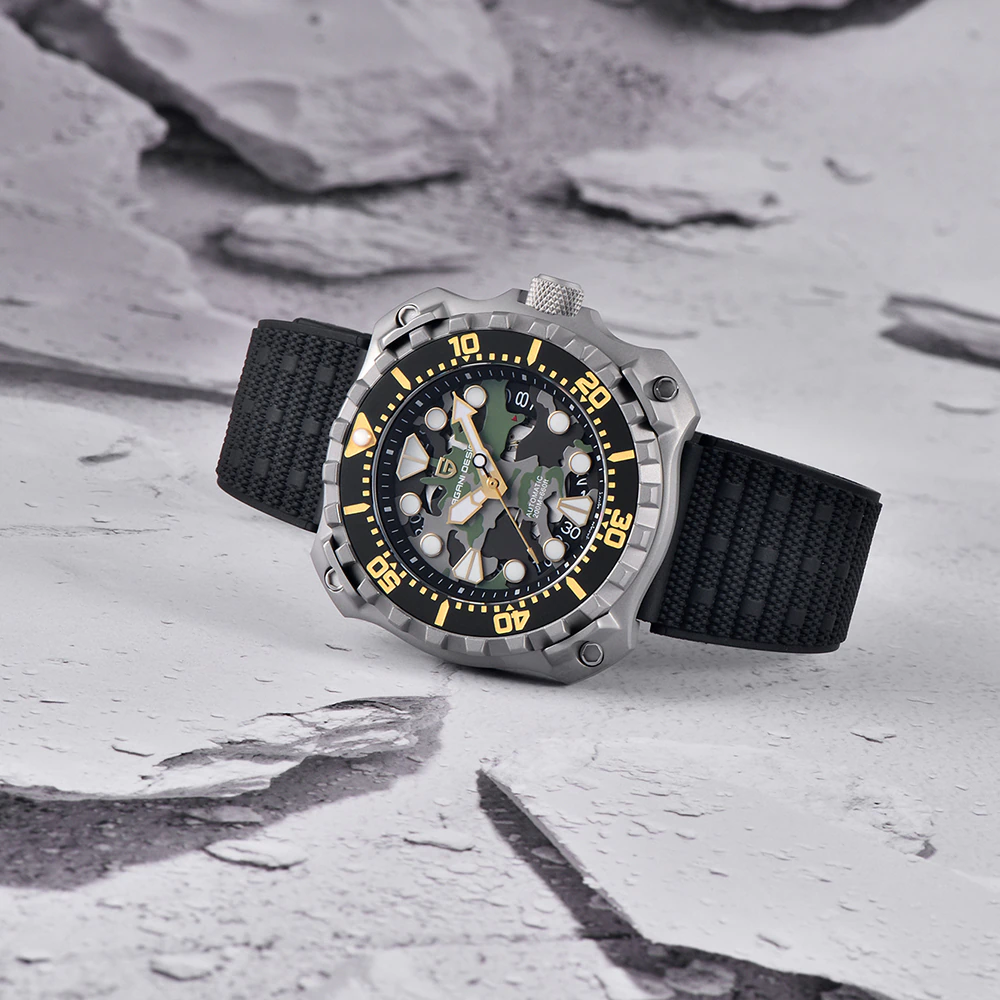Годинники Pagani Design YN009 Silver-Camo — це стильний вибір для чоловіків, які цінують функціональність та сучасний дизайн. Виготовлені з нержавіючої сталі, ці годинники мають високий рівень водонепроникності до 100 метрів, що робить їх ідеальними для активного способу життя. Квадратний корпус сріблястого кольору в поєднанні з чорним гумовим ремінцем надає годиннику армійського стилю. Сапфірове скло забезпечує високий рівень захисту, а люмінесцентна підсвітка дозволяє зручно зчитувати час у темряві. Годинники обладнані механічним механізмом з автопідзаводом, мають функцію календаря та індикацію годин, хвилин, секунд і дати. Розміри годинника складають 43,3 х 40,7 мм, вагу — 116 г, а довжина та ширина ремінця становлять 24 та 22 мм відповідно. Гарантія на виріб — 12 місяців.