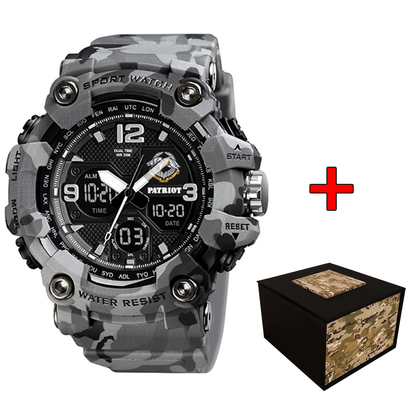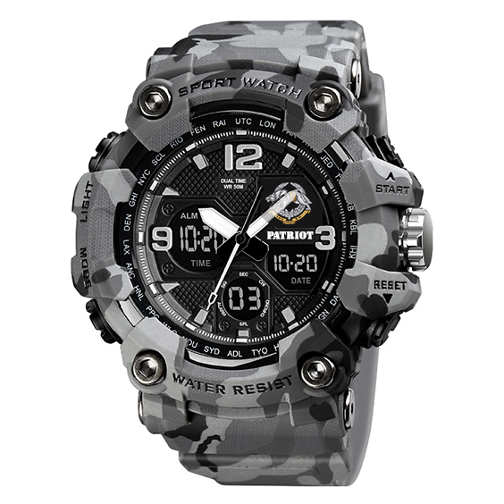 Представляємо вам наручний годинник Patriot 006CMGYSSO в стильному сірому камуфляжному дизайні, який ідеально підходить для активних чоловіків. Цей спортивний годинник виготовлено в Україні та поєднує у собі відмінні технічні характеристики та сучасний стиль.