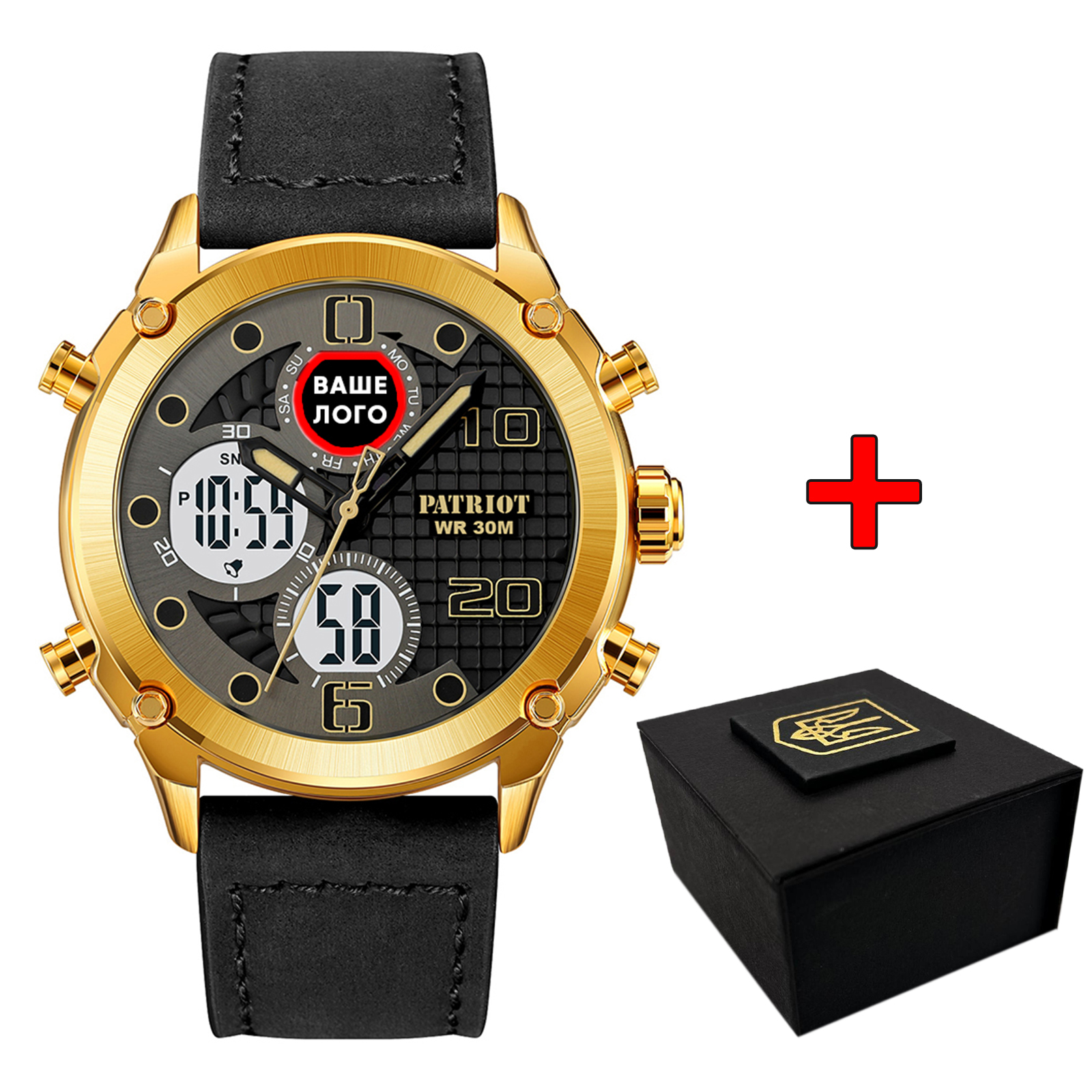 Представляємо вам наручний годинник Patriot 017 Ваше Лого Gold-White – ідеальне поєднання стилю та функціональності. Цей стильний аксесуар має круглу золоту корпусну оболонку розміром 45,9 мм та елегантний чорний шкіряний ремінець довжиною 26 см, що підкреслить вашу унікальність та смак.