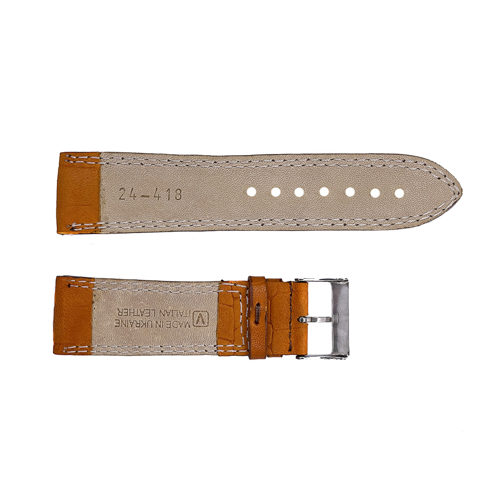 Ремінь годинника кожаний 418 24×22 см світло-коричневий, виготовлений із натуральної шкіри під крокодила. Має класичну форму з двома половинками, довжина ремінця становить 217 см. Застібка – срібляста пряжка. Підходить для годинників із кріпленням для ремінка 24 мм. Універсальний дизайн, підходить для всіх. Виробництво – Китай. Бренд: Bez-brenda. Вага: 14 г.