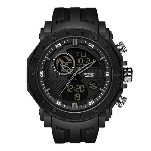 Корпус виготовлений з пластику, його товщина становить 17 мм, а діаметр – 50 мм. Чорний колір корпусу та ремінця надає йому сучасного вигляду. Годинник оснащений кварцовим і електронним механізмом, комбінованим цифербалом та різноманітними функціями, такими як секундомір, таймер, будильник, підсвічування, а також відображення дати, дня тижня і місяця.