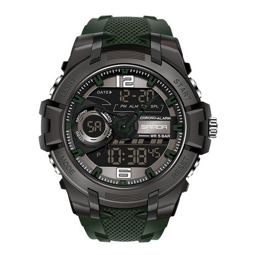 Пропонуємо вашій увазі чоловічий спортивний годинник Sanda 6015 Green-Black. Цей стильний аксесуар має водонепроникність 50 WR та виготовлений з високоякісної годинникової сталі. Діаметр корпусу складає 50 мм, а товщина – 18 мм. Ремінець із зеленого пластику забезпечує зручність і комфорт під час носіння. Годинник обладнаний кварцовим і електронним механізмом, а також багатофункціональним циферблатом, на якому ви знайдете показники годин, хвилин, секунд, дати, дня тижня, місяця, секундоміра, будильника та підсвічування. Гарантія на годинник становить 12 місяців. Sanda 6015 – ідеальний вибір для активних чоловіків, які цінують надійність та стиль.
