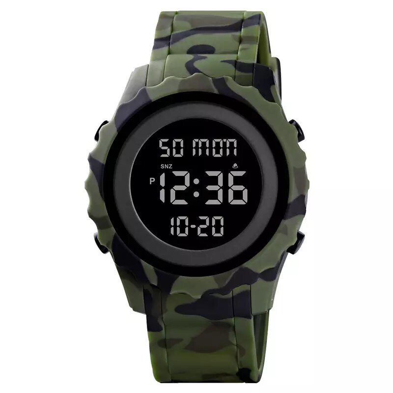 Годинник Skmei 1631CMGN Camo Green – ідеальний вибір для активних чоловіків. Завдяки водонепроникності до 50 м, полімерному корпусу та каучуковому ремінцю, він відзначається надійністю та комфортом у використанні. Спортивний, армійський і casual стиль в поєднанні з камуфляжними кольорами роблять його універсальним аксесуаром. Електронний механізм забезпечує точність, а функції будильника, календаря та секундоміра додатково підвищують його функціональність. Цей гурман технологій важить лише 40 г, має розміри 48 х 42 мм та оснащений електролюмінесцентним підсвічуванням для зручності в темряві. Годинник постачається з 12-місячною гарантією, виготовлений в Китаї та має арабські цифри для зручності читання.