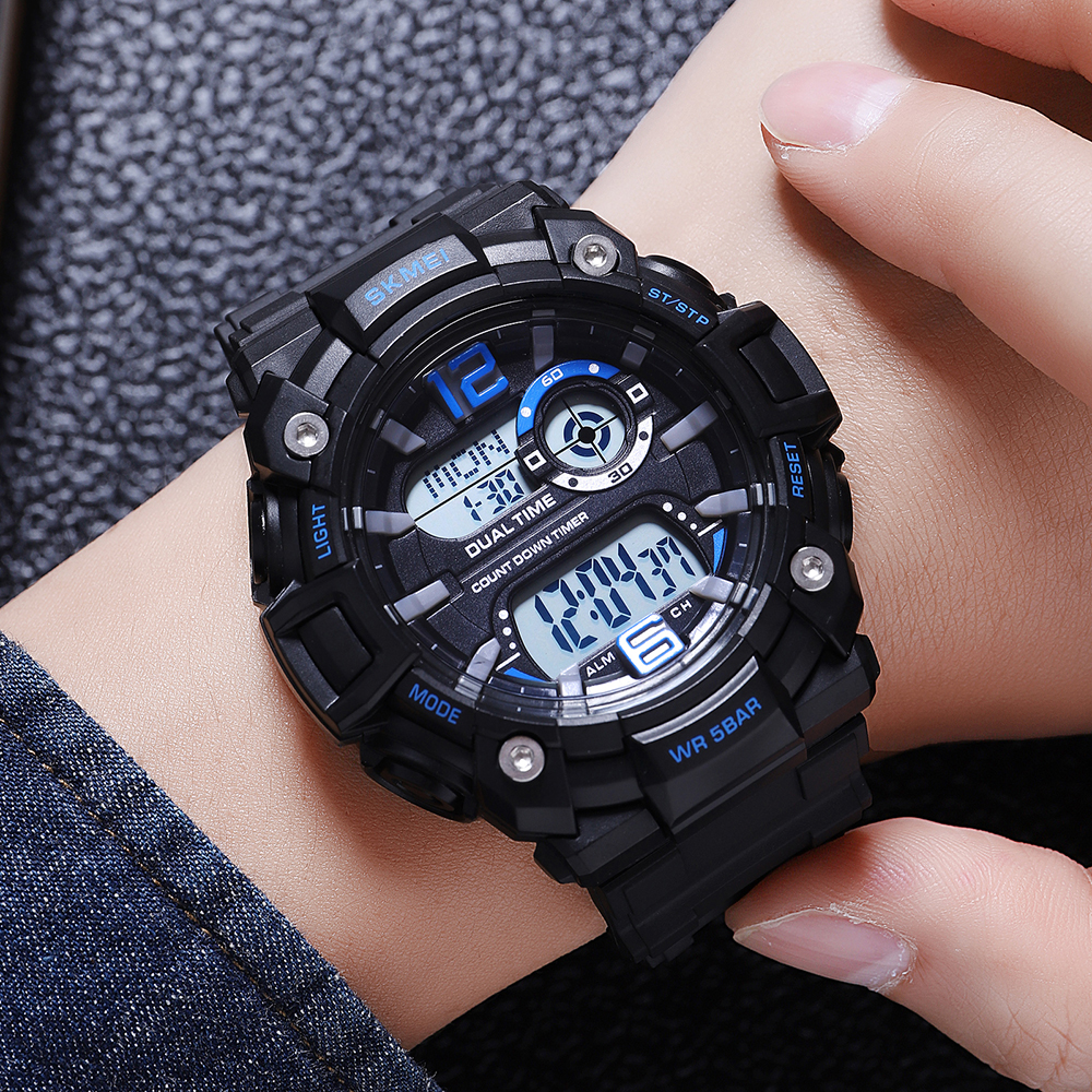 Годинник Skmei 2018BUWT Blue-White – стильний спортивний аксесуар для чоловіків. Виготовлений з міцного полімерного корпусу та каучукового ремінця, він має водонепроникність до 50 метрів. Електронний механізм з індикацією годин, хвилин і секунд, а також дня тижня та числа забезпечує точність і зручність використання. Годинник оснащений функціями будильника, календаря, другого часового поясу та секундоміра. Полімерне скло і електролюмінесцентне підсвічування роблять його функціональним навіть у темряві. Чорний корпус та ремінець надають йому стильного вигляду, а компактні розміри 57,6 х 53,3 мм і вага 61 г роблять його комфортним у носінні. Гарантія на годинник становить 12 місяців. Вироблено в Китаї.