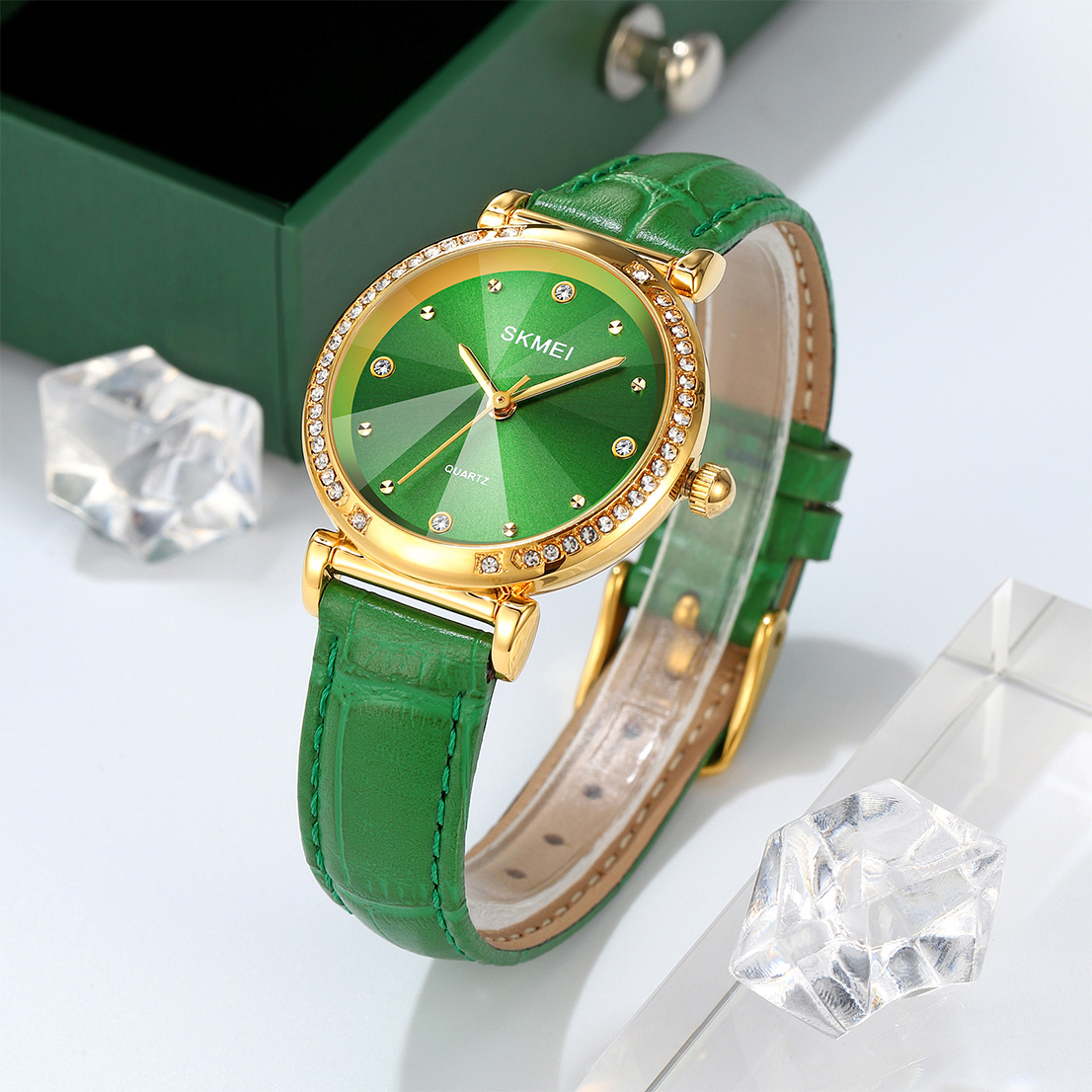 Годинник Skmei 2072GN Green – стильний жіночий аксесуар з класичним дизайном. Має круглу золоту корпус, виконаний з металу, та зелений шкіряний ремінець. Водонепроникність до 30 м забезпечує надійність у різних умовах. Кварцовий механізм гарантує точність, а мінеральне скло захищає циферблат з крапковою індикацією годин, хвилин і секунд. Розміри годинника складають 37,8 х 30,6 мм, а вага – лише 28 г. Гарантія – 12 місяців. Довжина ремінця – 22 см, ширина – 12 мм.